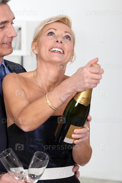 Пара открывает бутылку шампанского