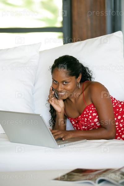 Темнокожая женщина с ноутбуком на диване
