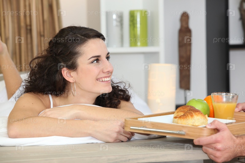 Мужчина подает женщине завтрак в постель