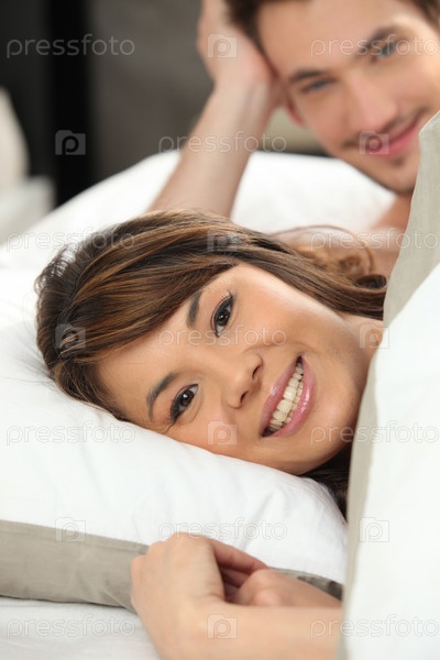 Счастливая молодая пара лежит в постели
