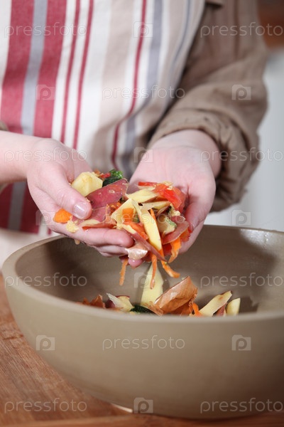 Женщина собирает кожуру от овощей