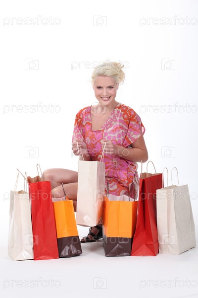Великолепная блондинка с пакетами, изолированная на белом