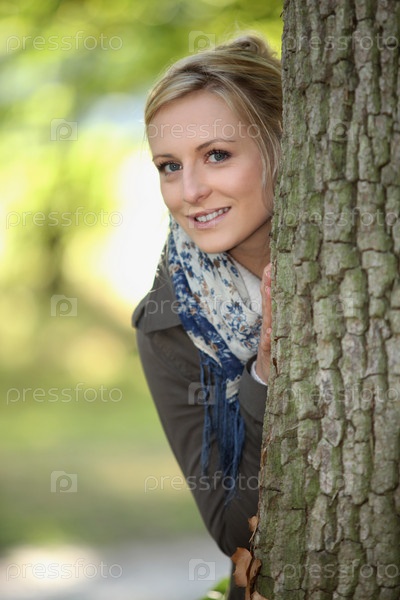 Блондинка стоит за деревом
