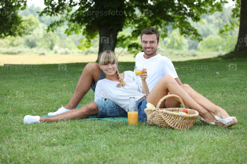 Молодая пара на пикнике на лугу