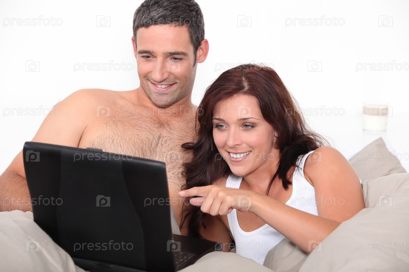 Симпатичная пара в постели с ноутбуком
