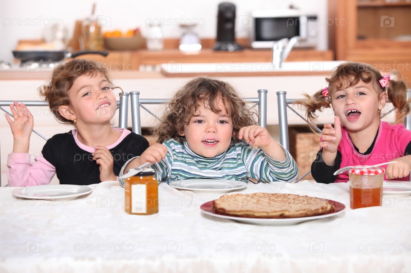 Дети едят блины на завтрак