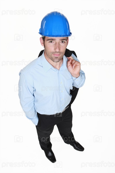 Предприниматель в каске на белом фоне