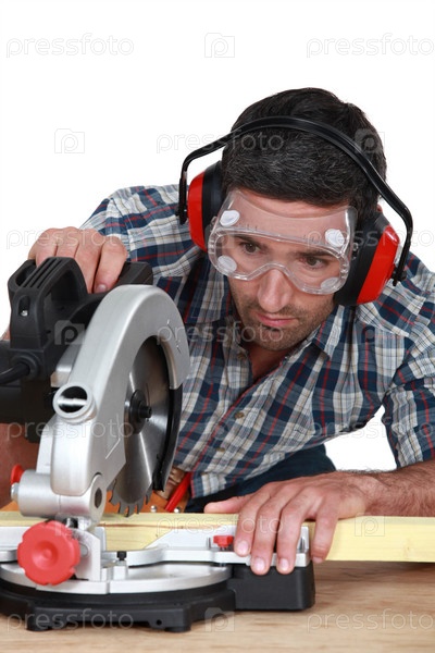 Мужчина с циркулярной пилой режет доску