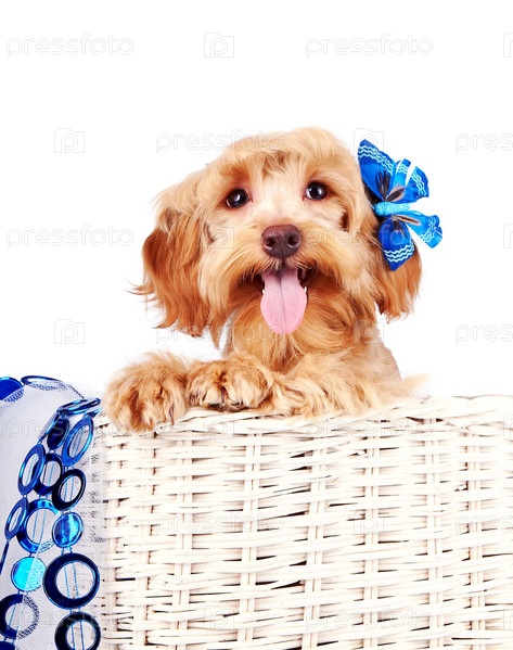 Декоративная собака в белой корзине