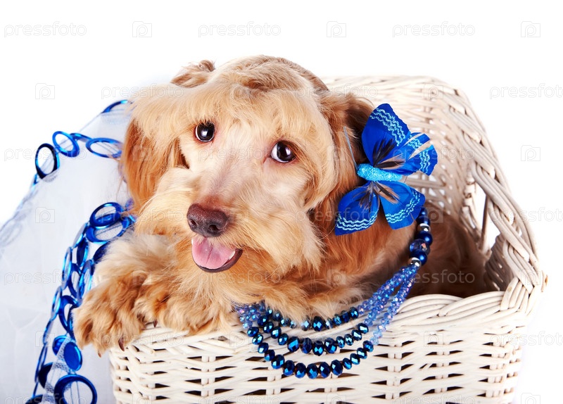 Декоративная собака в белой корзине