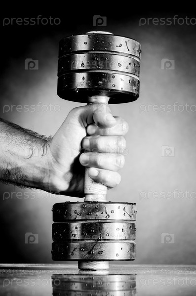Мужская рука держит металлическую гантель