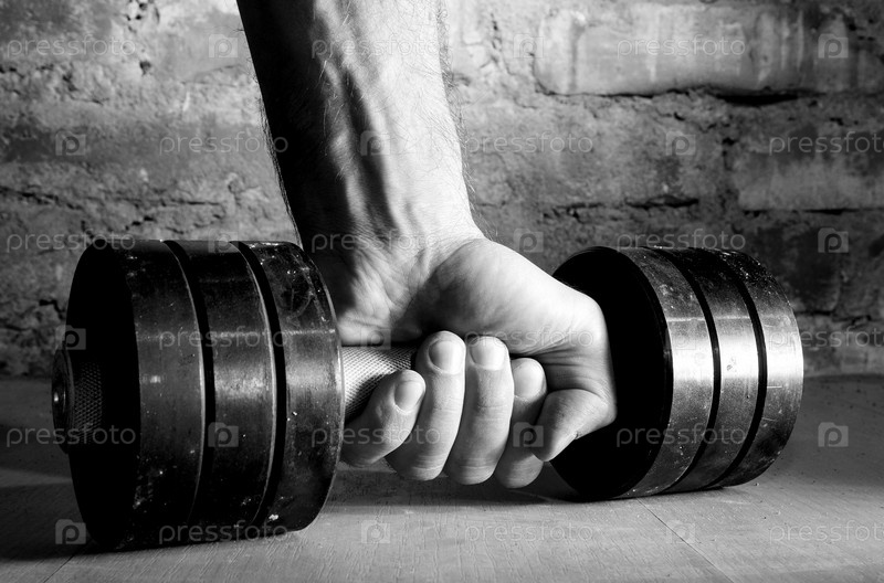 Мужская рука держит металлическую гантель