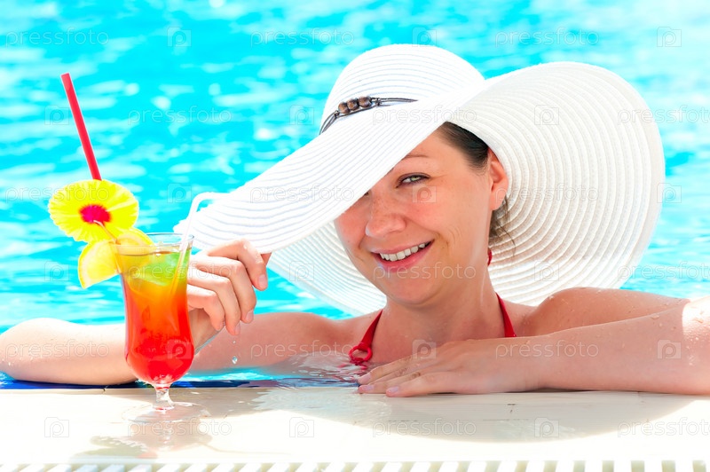Девушка с коктейлем в бассейне
