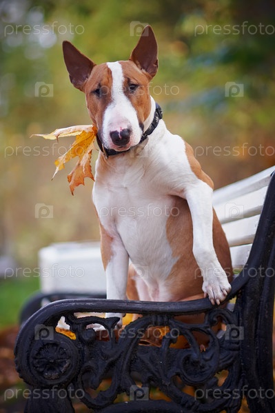 Рыжий бультерьер сидит на скамейке
