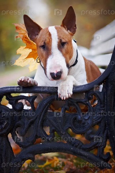 Рыжий бультерьер лежит на скамейке