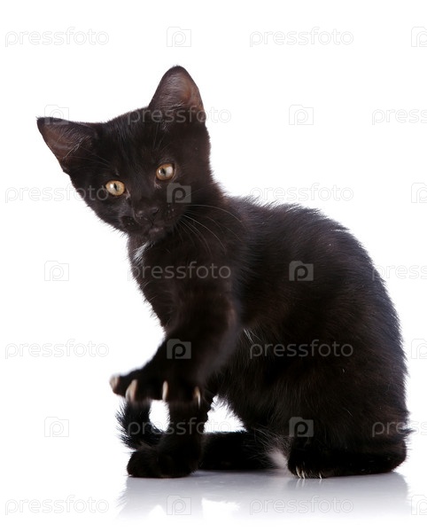 Черный котенок сидит с поднятой лапой с когтями