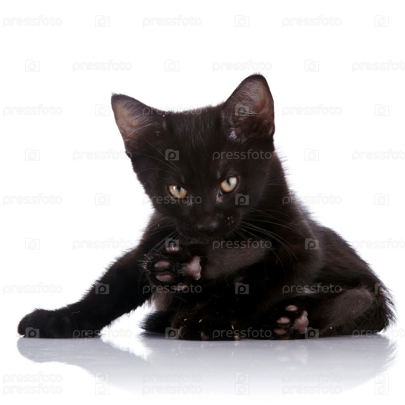 Черный котенок лежит на белом фоне