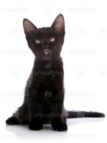Черный котенок сидит на белом фоне