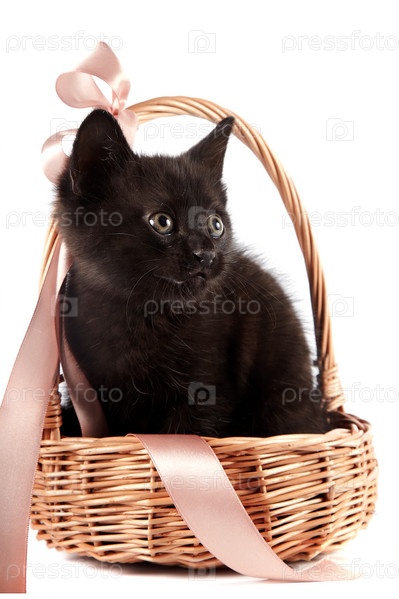 Черный котенок в плетеной корзине с лентой