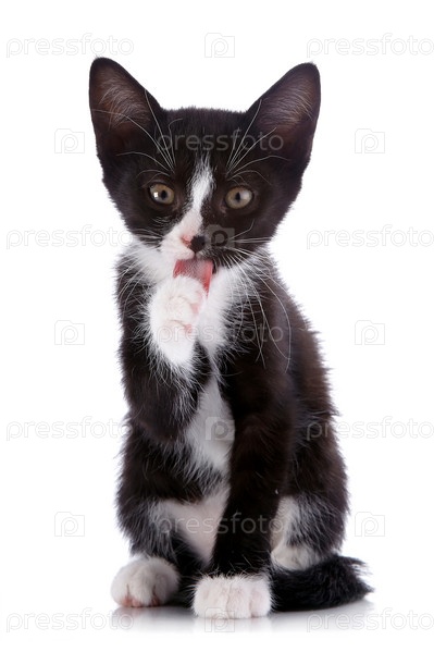 Котенок сидит и лижет лапу