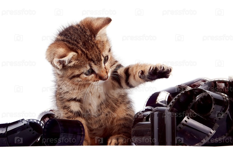 Полосатый котенок играет с пленкой