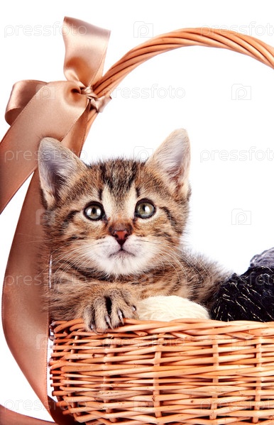 Полосатый котенок в корзине с шерстяными клубками