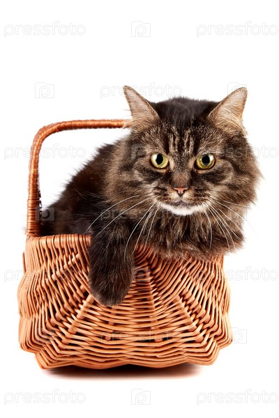 Пушистый кот в плетеной корзине