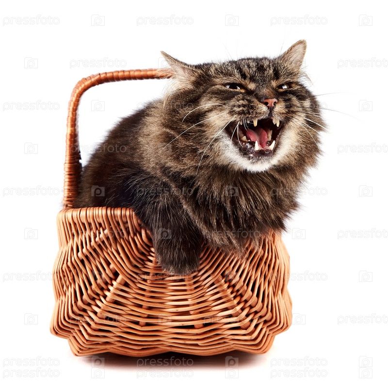 Пушистый кот в плетеной корзине