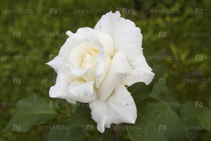 Бутон белой розы, окруженный зелеными листьями