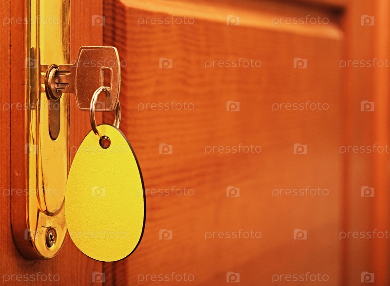Ключ в замочной скважине с пустой биркой