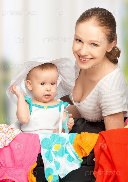 Мать с ребенком и чемоданом готова для путешествия в отпуск