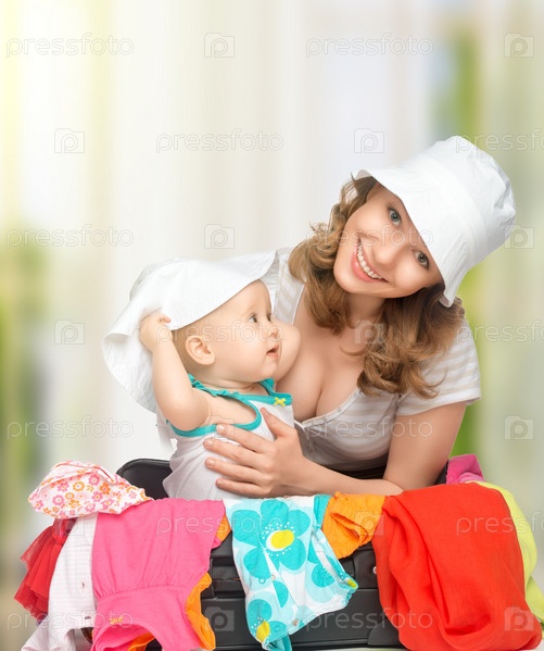 Мать и дочь с чемоданом и одеждой собираются в отпуск