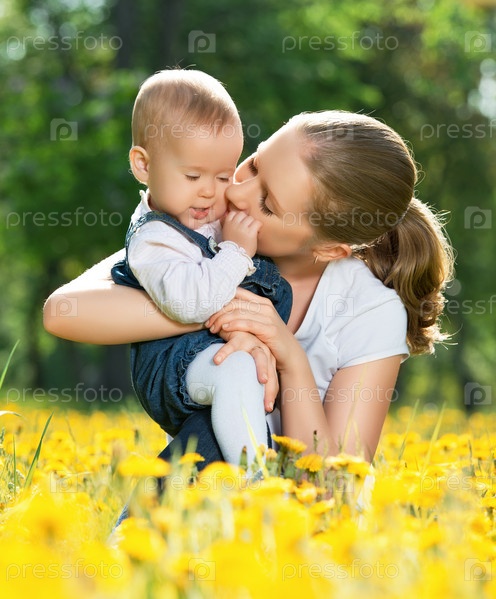 Счастливая семья на прогулке, мать целует ребенка