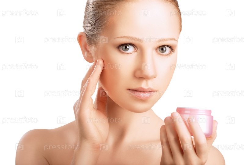 Уход за кожей. Красивая девушка с банкой крема, изолированная на белом фоне