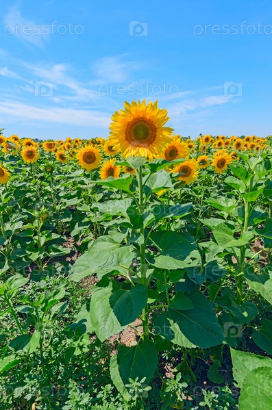 Поле подсолнухов на фоне голубого неба в России