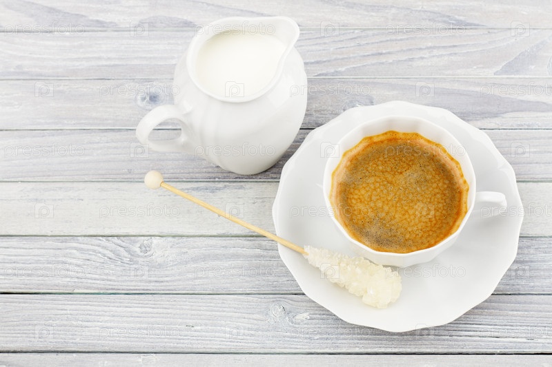 Кофе и кувшин молока на деревянном столе