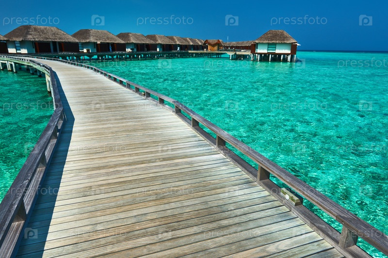Красивый пляж с водными бунгало