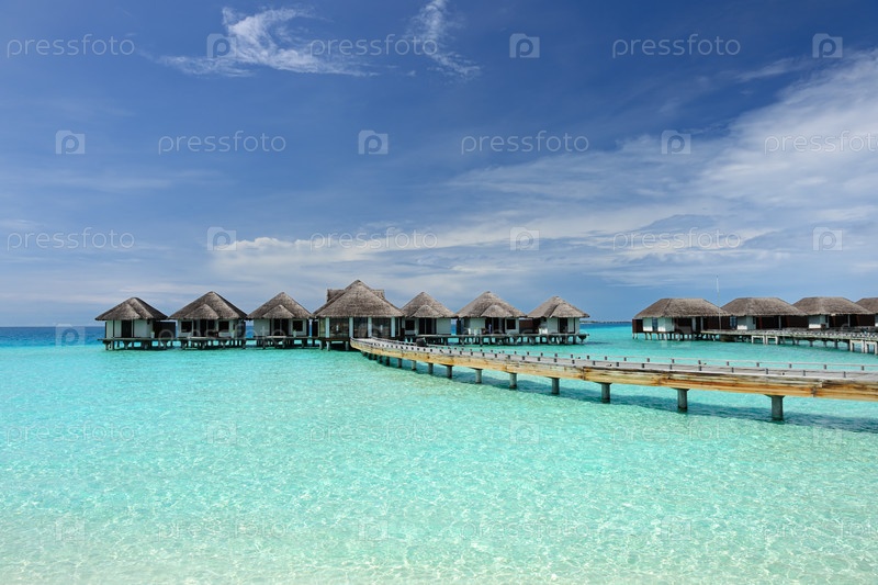 Красивый пляж с водными бунгало