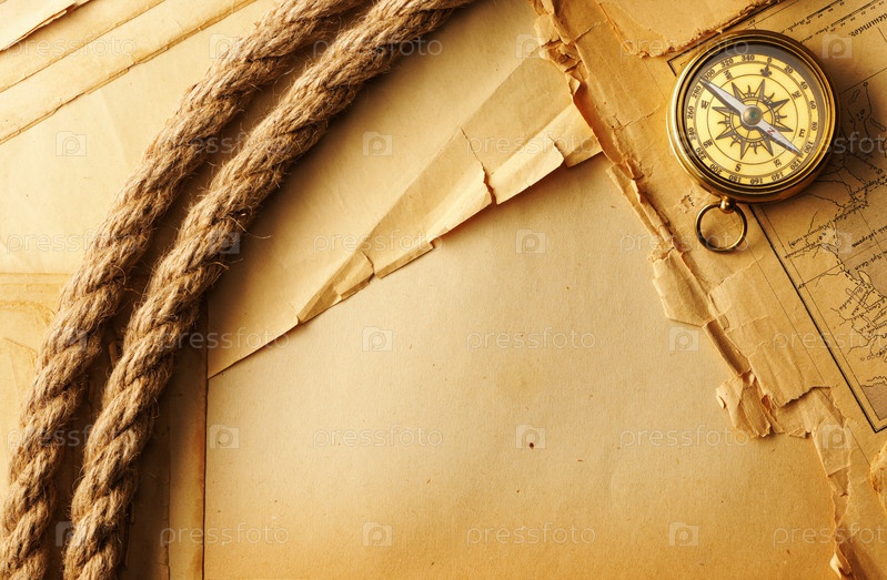 Антикварный компас и веревка на старой карте