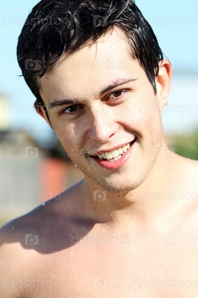 Портрет улыбающегося молодого человека с мокрыми волосами