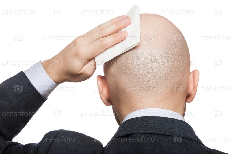 Мужчина протирает лысую вспотевшую голову тканевой салфеткой