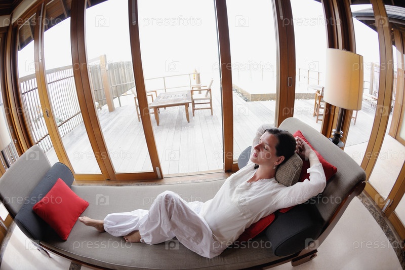 Счастливая молодая женщина отдыхает у себя дома на диване