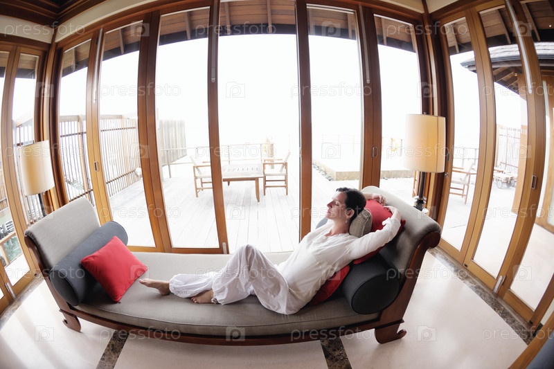 Счастливая молодая женщина отдыхает у себя дома на диване