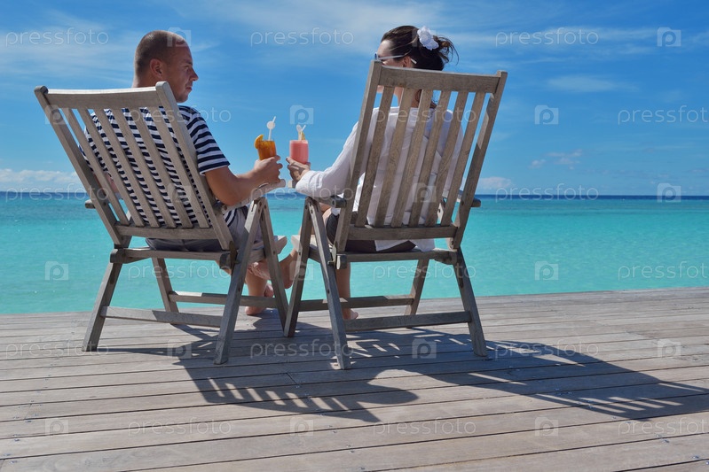 Счастливая молодая пара отдыхает и пьет освежающие напитки