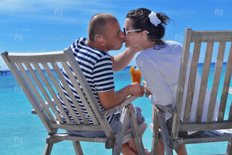 Счастливая молодая пара отдыхает и пьет освежающие напитки