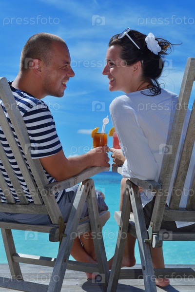 Счастливая молодая пара отдыхает и пьет освежающие напитки