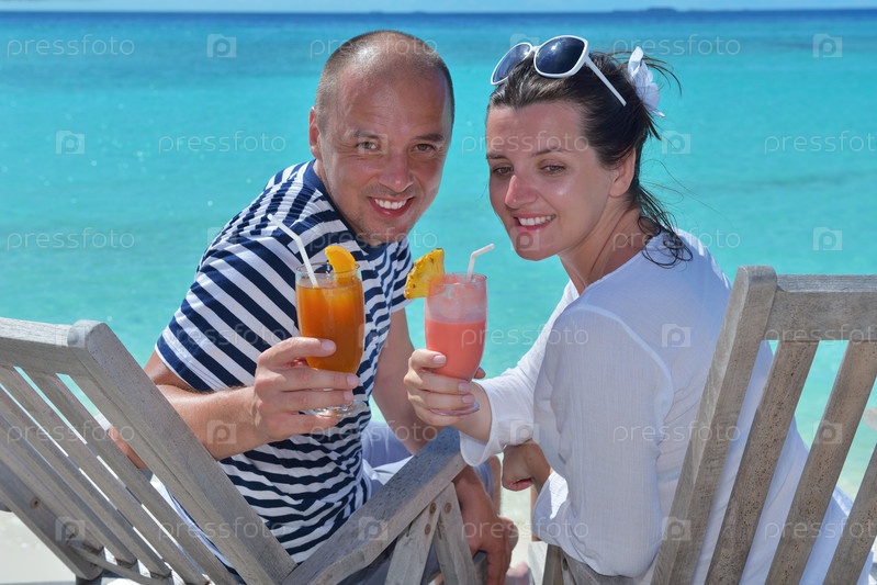 Счастливая молодая пара отдыхает и пьет освежающие напитки