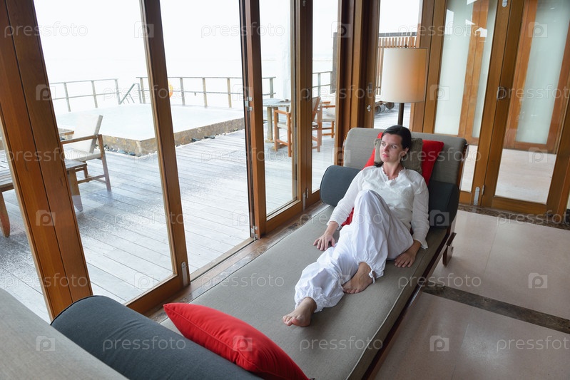 Счастливая молодая женщина отдыхает у себя дома на диване
