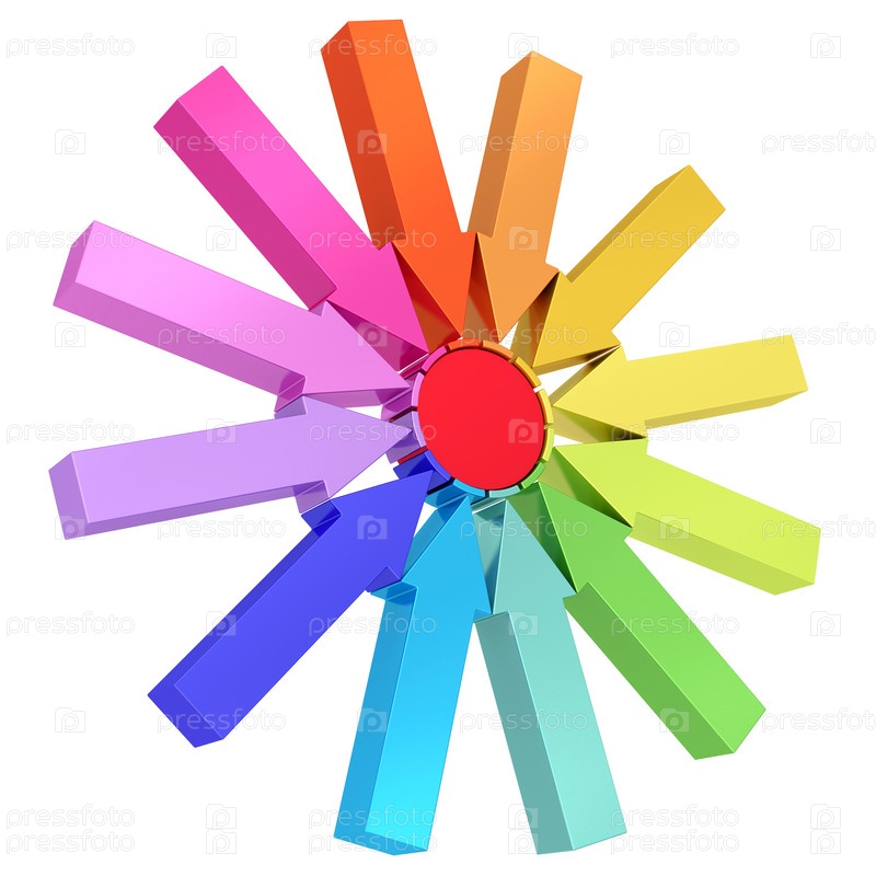 Красочные стрелки, направленные к красному центру на белом. 3D изображение высокого разрешения