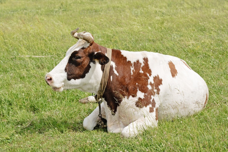 Белая с коричневыми пятнами корова лежит на зеленом лугу